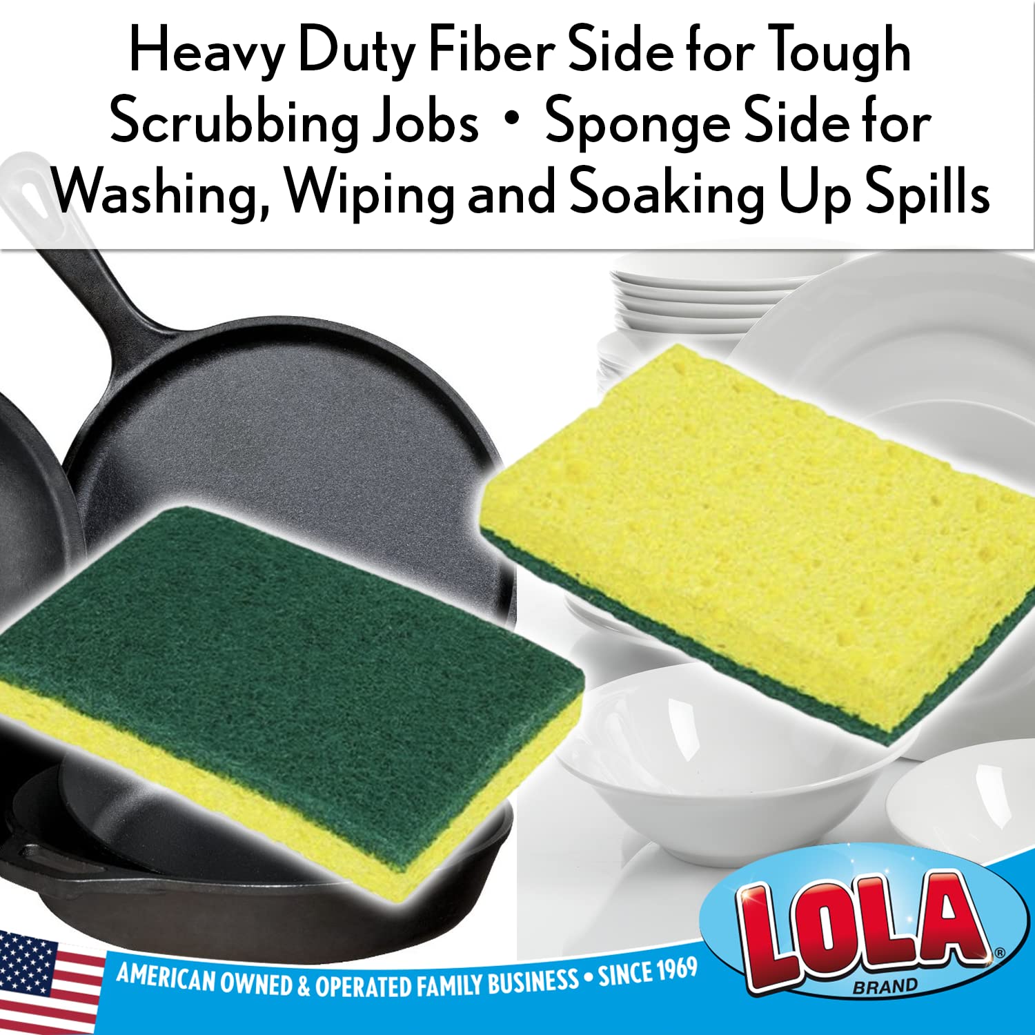 - ➤ DUAL PURPOSE SCRUBBER - Lola's cellulose sponge & scourer is a dual-purpose scrubber. Its heavy-duty green fiber side is great for a range of tough scrubbing jobs, and the Cellulose sponge side is used for washing, wiping, and soaking up spills.