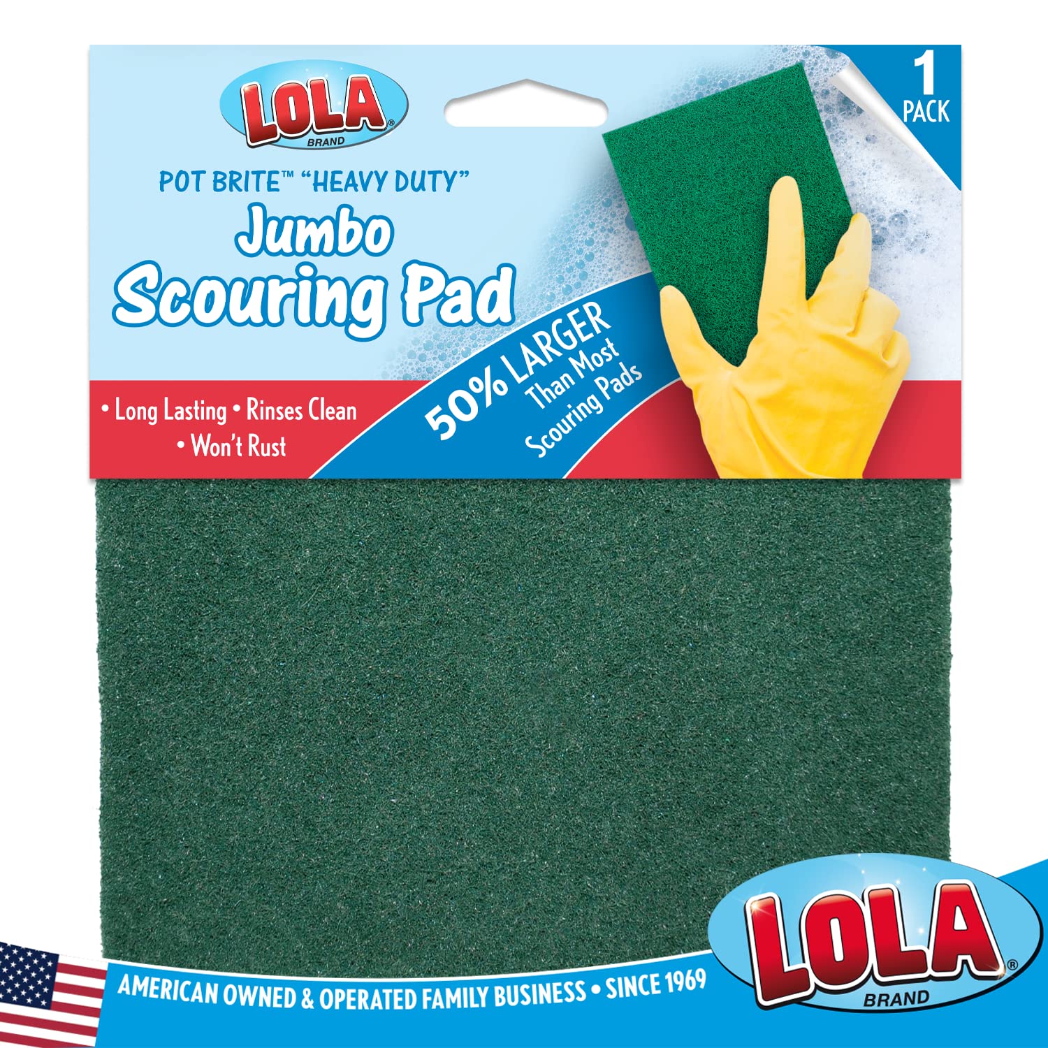 - ➤ JUMBO SIZED PADS - 6" x 6" Lola Pot Brite jumbo scouring fiber is a heavy-duty cleaning scrubber scour pad made from long-lasting synthetic nylon & polyester non-woven material. Each pad is an oversized heavy-duty scourer that is 33% larger than typical 4" x 6" scouring pads.