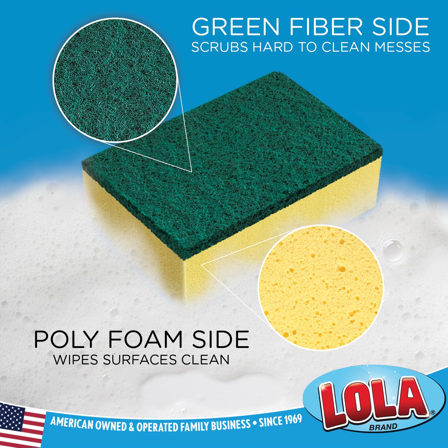 - ➤ DUAL PURPOSE SCRUBBER - Lola's Pot Brite Scour N' Sponge is a dual-purpose sponge scrubber. Its Fiber side scrubs and scours and the Sponge side wipes and dries. It's a great cleaning pads for cleaning Pots, Pans, Oven Grills, and more!