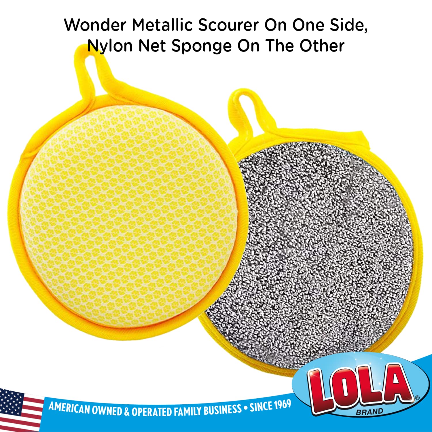 - ➤ DUAL-SIDED SCOURER - This Lola's scouring pad is a dual-sided cleaning sponge pad. Wonder metallic scourer on one side for scouring, And nylon net sponge side is for wipes cleaning.