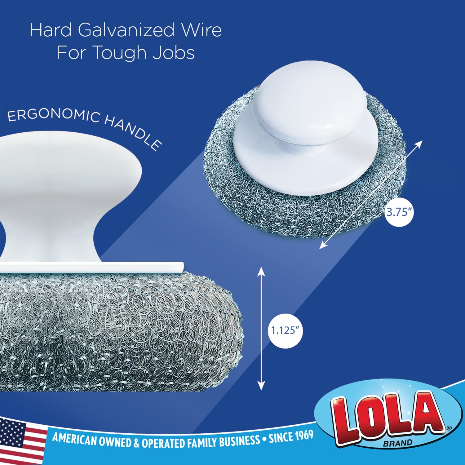 - ➤ ERGONOMIC COMFORTABLE DESIGN - Lola's galvanized steel wire mesh scouring pad comes with a hand-saving comfort knob that fits in the palm of your hand and saves your hand from the harsh abrasive wire.